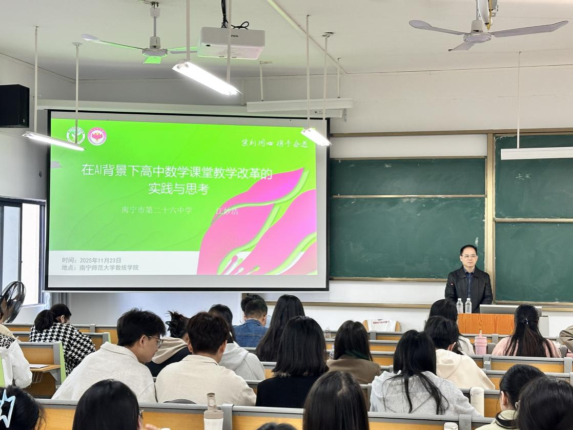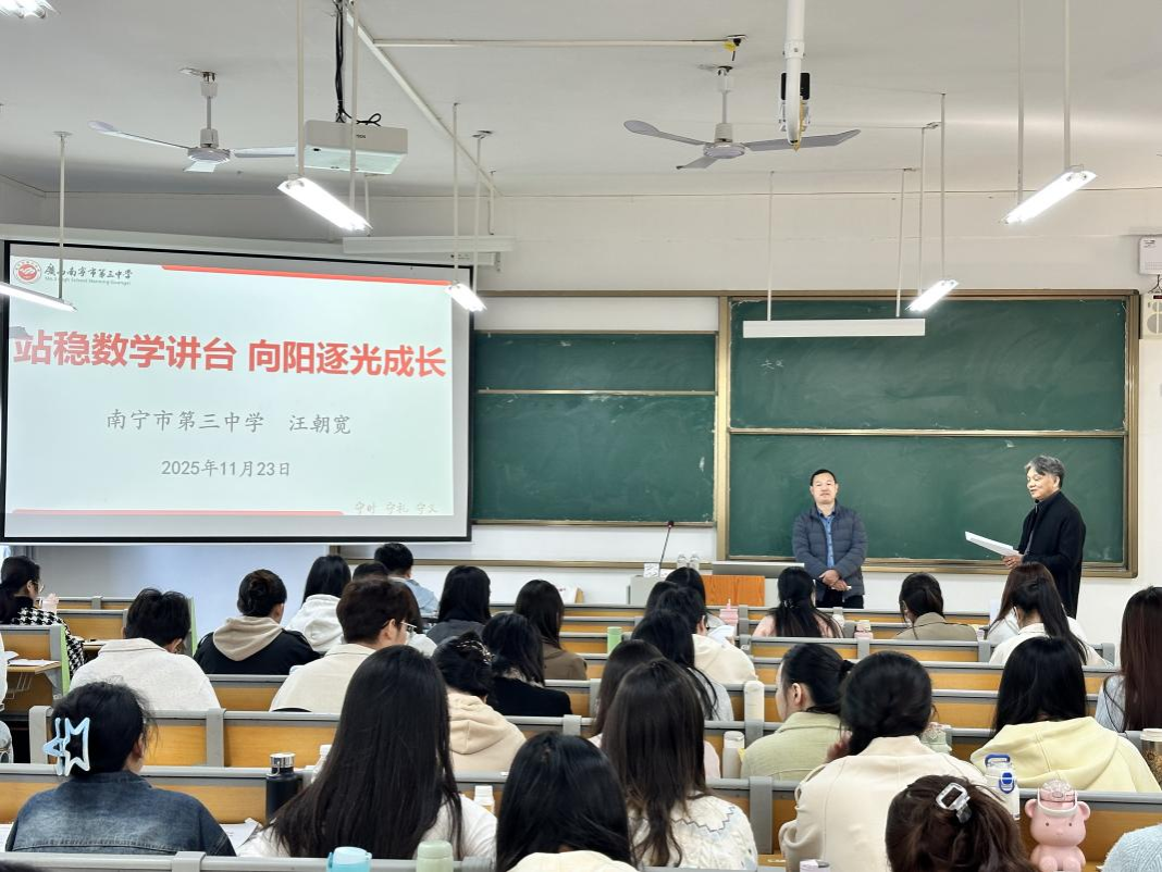 同时,来自南宁三中、十四中、二十六中、三十三中、天桃实验公司的五位校外硕导,为研究生做了精彩的报告,内容涉及中学教学改革、践行教育家精神、拔尖人才培养等,为员工提供了数学教学改革研究的方法,点亮了研究生的“数学眼光”。