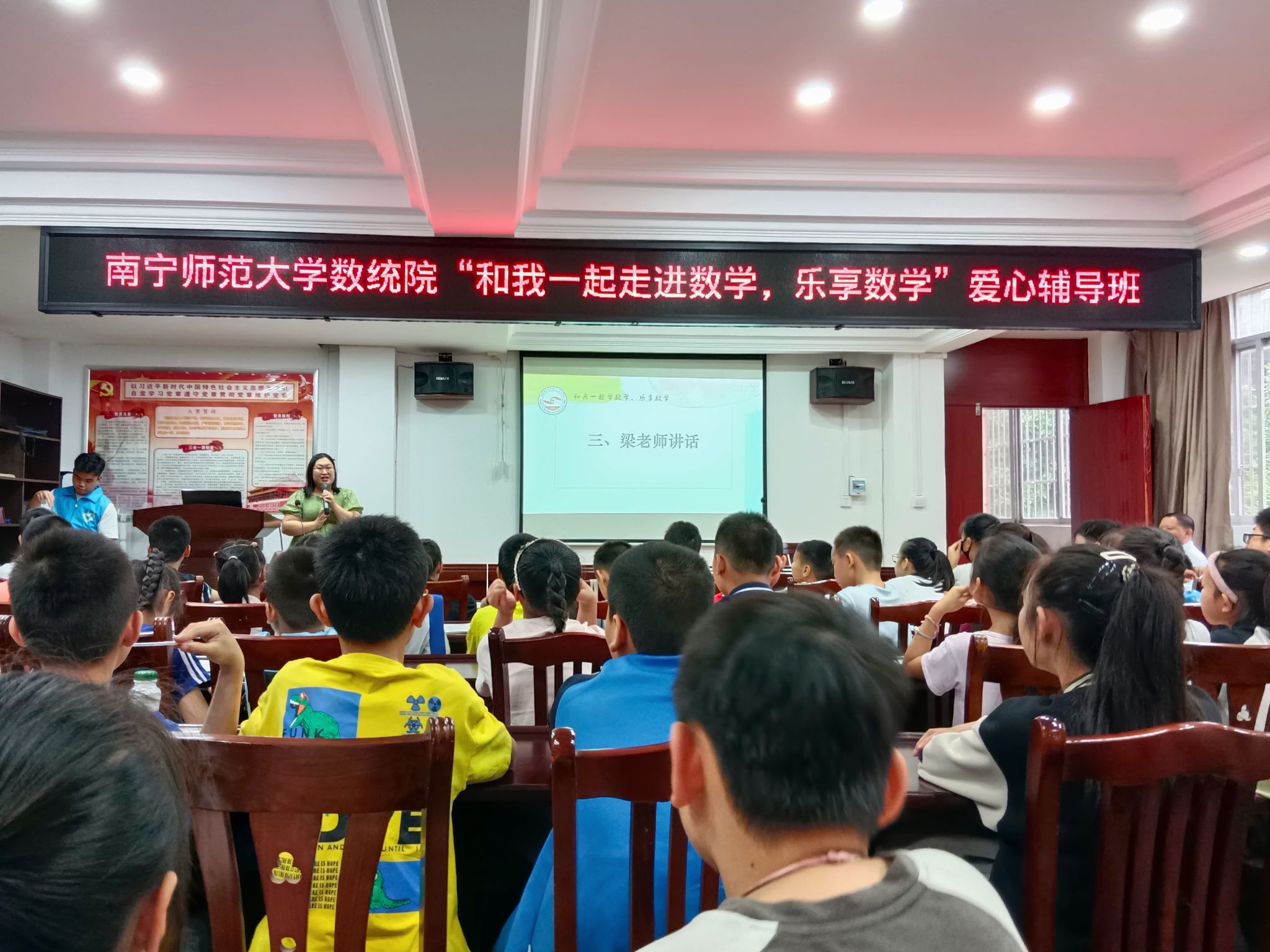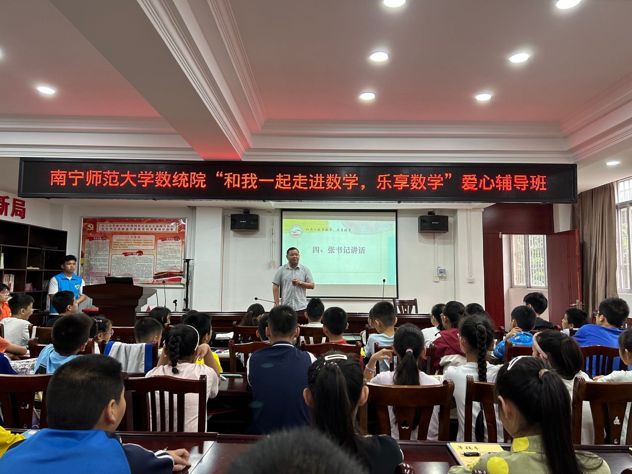 4月20日、4月27日,william威廉中文官网在南宁市武鸣区和平社区分别举行了以“和我一起走进数学,乐享数学”为主题的爱心辅导活动开幕式暨第一期、第二期爱心辅导活动。武鸣和平解放社区党委张健书记、公司梁卡霖老师和35名志愿者、60余名三到六年级小员工参加此次活动。本次开幕式由公司团委副书记蒋杭同学主持。