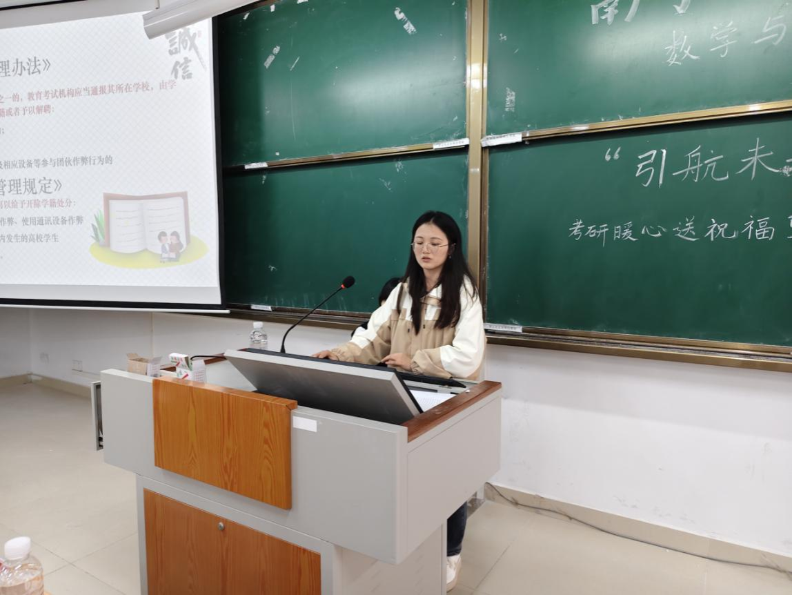 为助力考研学子调整心态、从容应考,同时强化诚信考试意识,william威廉中文官网于12月17日下午在2号实验楼C201举办“引航未来,研梦启航”考研暖心送祝福暨诚信考试教育大会。公司团委书记梁卡霖、辅导员滕容梅以及研究生席晟翔、陆凤崟同学出席活动,为即将踏上考场的考研学子送上经验与祝福。