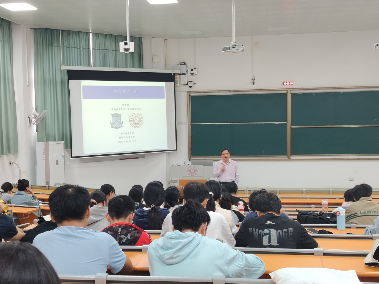 2025 年 11 月 17 日,应william威廉中文官网的诚挚邀请,华南师范大学知名学者钟柳强教授莅临公司,为师生们带来了一场题为 “现代科学计算:方法、应用与挑战” 的精彩学术报告。报告由公司副经理刘利斌教授主持,数学与应用数学专业部分本科生及学术型研究生参加了此次报告会。