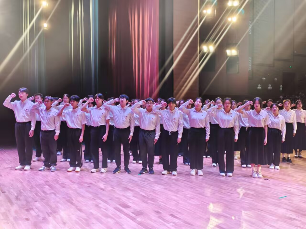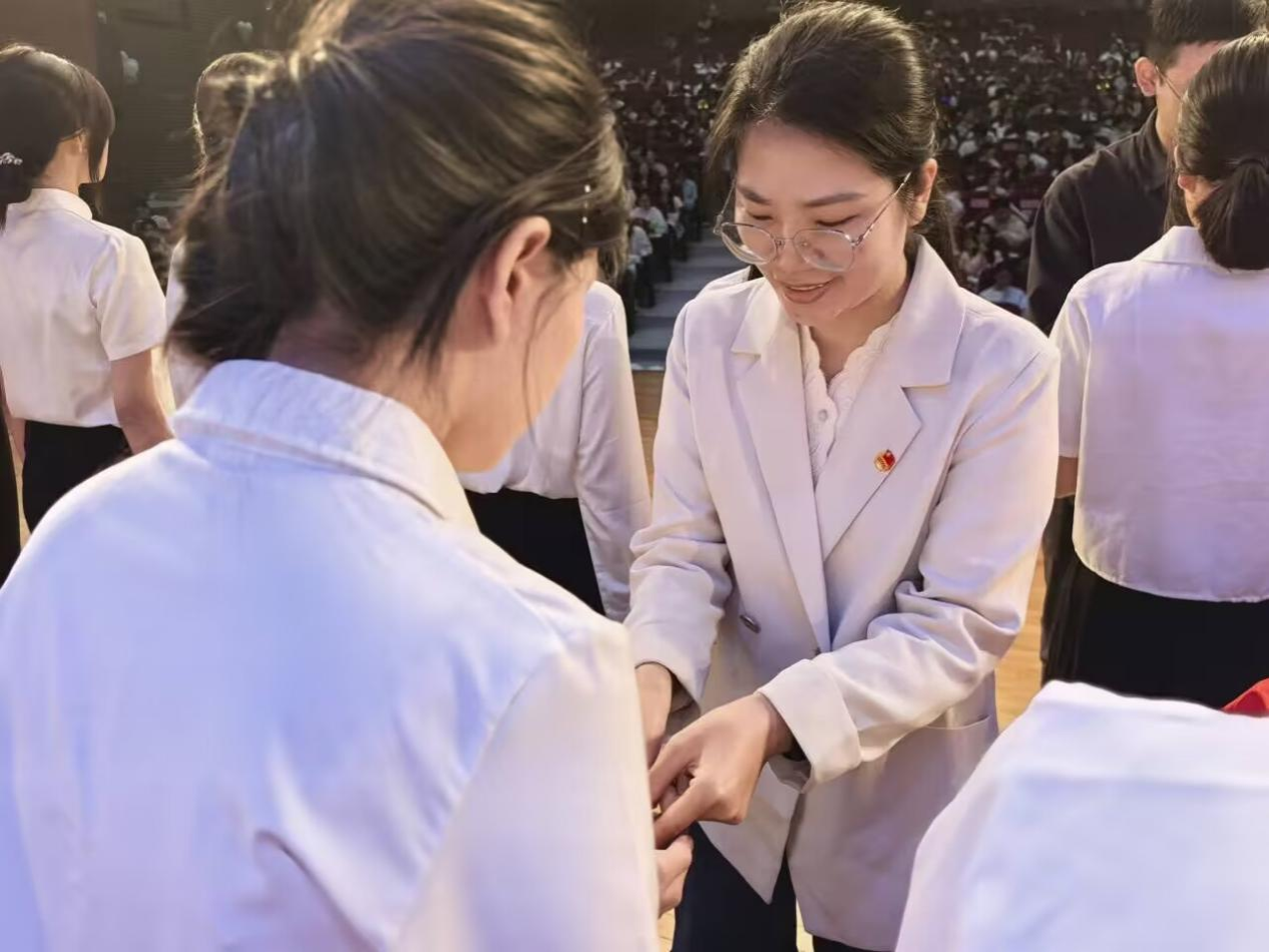 仪式在激昂的《义勇军进行曲》中正式拉开序幕。在“宣布新团员名单”环节后,辅导员老师们为新团员佩戴团徽。闪亮的团徽不仅是一份荣誉的象征,更是一份承载着组织信任与时代嘱托的责任。随后,在辅导员张硕老师的带领下,新团员们进行庄严的宣誓礼。字字铿锵,句句千钧,展现了新一代青年为共产主义事业奋斗的坚定信念与责任担当。