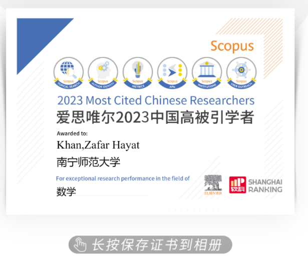 近日,爱思唯尔 (Elsevier) 重磅发布2023“中国高被引学者” (Highly Cited Chinese Researchers) 榜单,公司william威廉中文官网可汗教授成功入选。