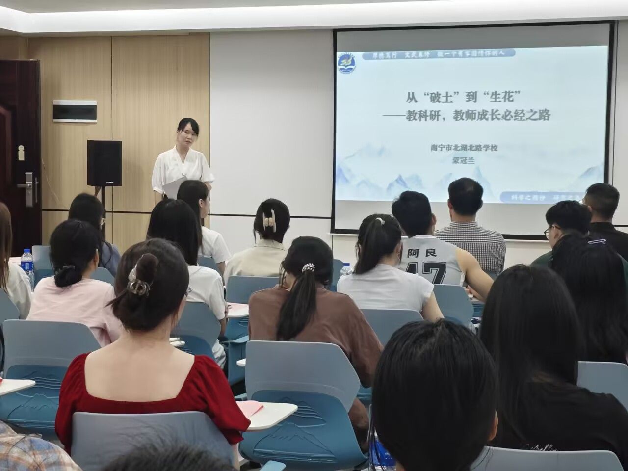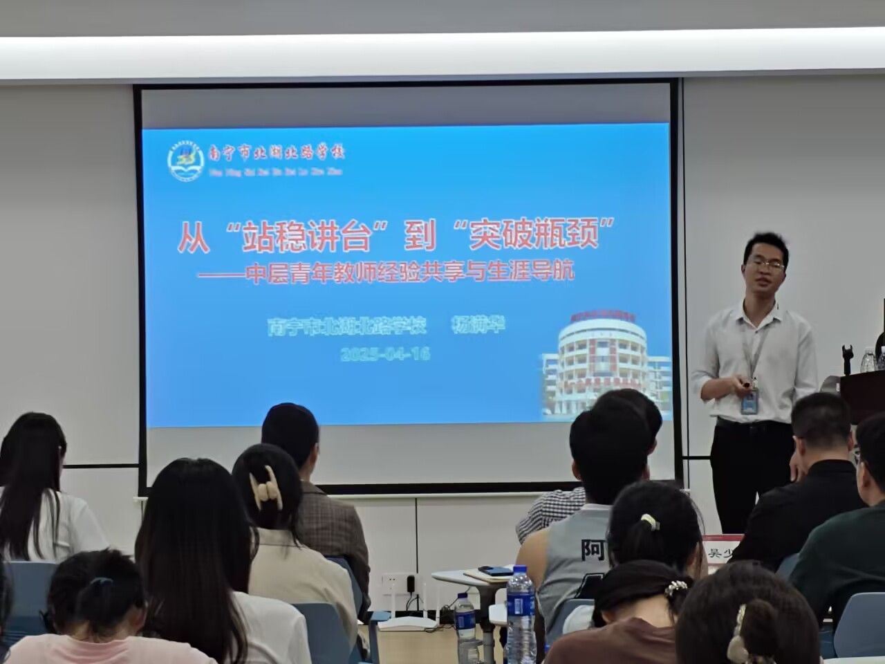 付进在致辞中热烈欢迎南宁市西乡塘区北湖北路公司领导老师的到来,同时指出本次活动搭建了高校与基础教育优质资源的对话平台,要求毕业生要珍惜学习机会,认真听讲、积极互动,提升职业技能,将个人职业规划融入基础教育高质量发展大局中。北湖北路公司吴少宁副董事长致辞并作课题主题报告,从报告中引申出新时代青年教师的职业要求和发展路径。南宁市北湖北路公司蒙冠兰老师作题为《从“破土”到“生花”——教科研,教师专业成长》的报告,从教科研的重要性出发,提醒青年教师做好职业规划;黄小怡老师作《从“站稳讲台”到“点亮心灯”——青年班主任专业成长案例分享》,分享了青年班主任工作可能遇见的困难和挑战,并提出具体的管理策略和日常活动指导;文誉频老师以《从“站稳讲台”到“闪耀赛场”——青年教师教学竞赛获奖案例分享》为题向在场的员工介绍如何上好一节公开课,建议青年教师放平心态、积极参加教学竞赛;杨满华老师以《从“站稳讲台”到“突破瓶颈”——中层青年教师经验共享与生涯导航》为题指出教师基本功、职业规划、责任和担当对于新教师入职到中层干部的重要作用,教师发展是不断学习、实践和反思的过程,青年教师要不断提升自身能力、应对教育改革与新要求。