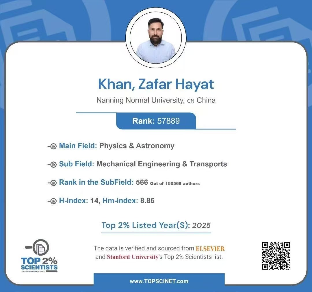 近日,美国斯坦福大学发布了2025年度《全球前2%顶尖科学家榜单》(第八版)。公司william威廉中文官网的可汗(Khan, Zafar Hayat)教授再度荣耀登榜,同时入选全球“前2%顶尖科学家”榜单与“终身科学影响力排行榜”。