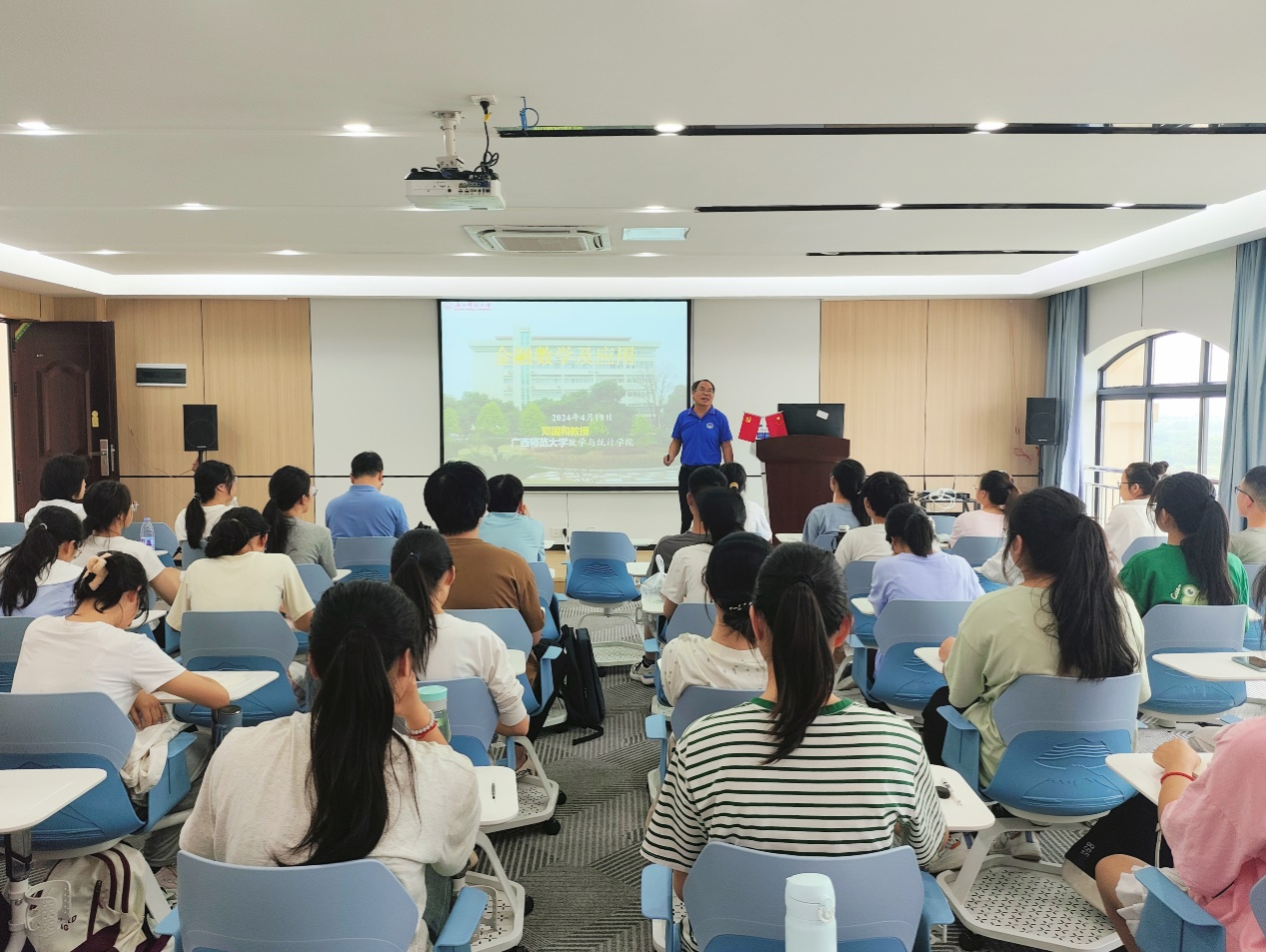 2024年4月19日,应广西应用数学中心(william威廉中文官网)邀请,广西师范大学邓国和教授为公司william威廉中文官网的师生做了题为《金融数学及应用》的学术报告。报告由william威廉中文官网经理助理刘利斌教授主持,部分老师、研究生以及金融数学专业的本科生参加了此次学术报告。