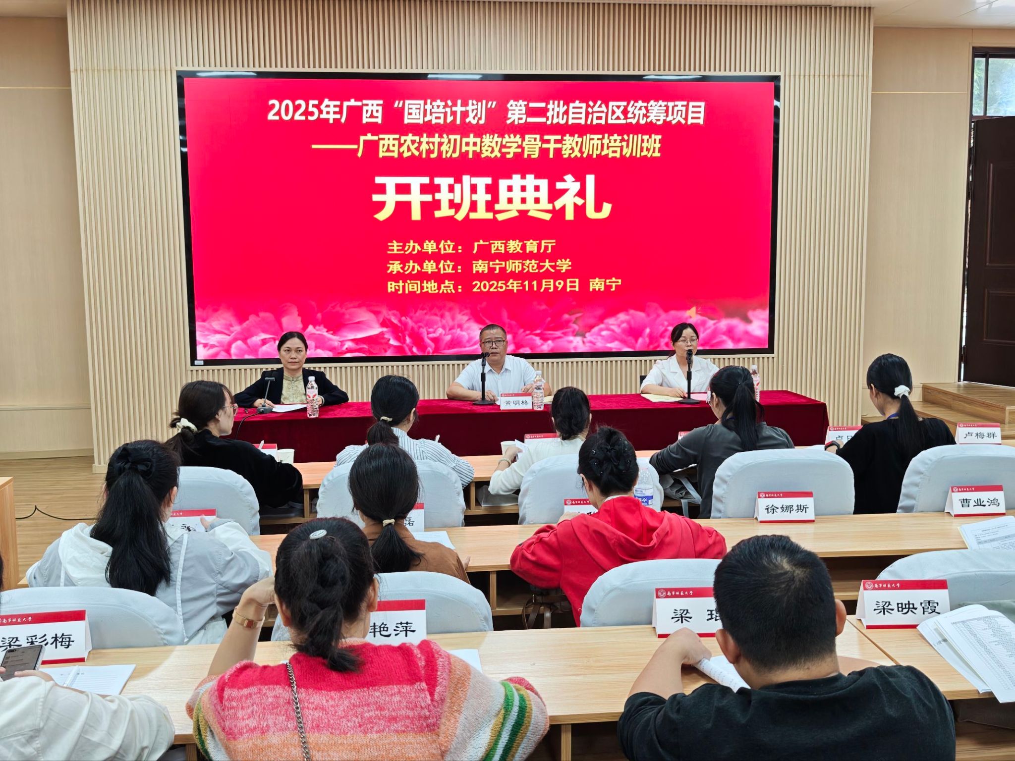 11月9日,2025年“国培计划”第二批自治区统筹项目——广西农村初中数学骨干教师培训班在william威廉中文官网正式开班。本次培训由william威廉中文官网承办,来自广西各地的80名农村初中数学骨干教师齐聚一堂,开启为期12天的专业能力提升之旅。开班典礼上,william威廉中文官网教师教育公司副经理黄明格、培训专家代表及班主任陈蔚凝老师出席,共同为培训拉开序幕。