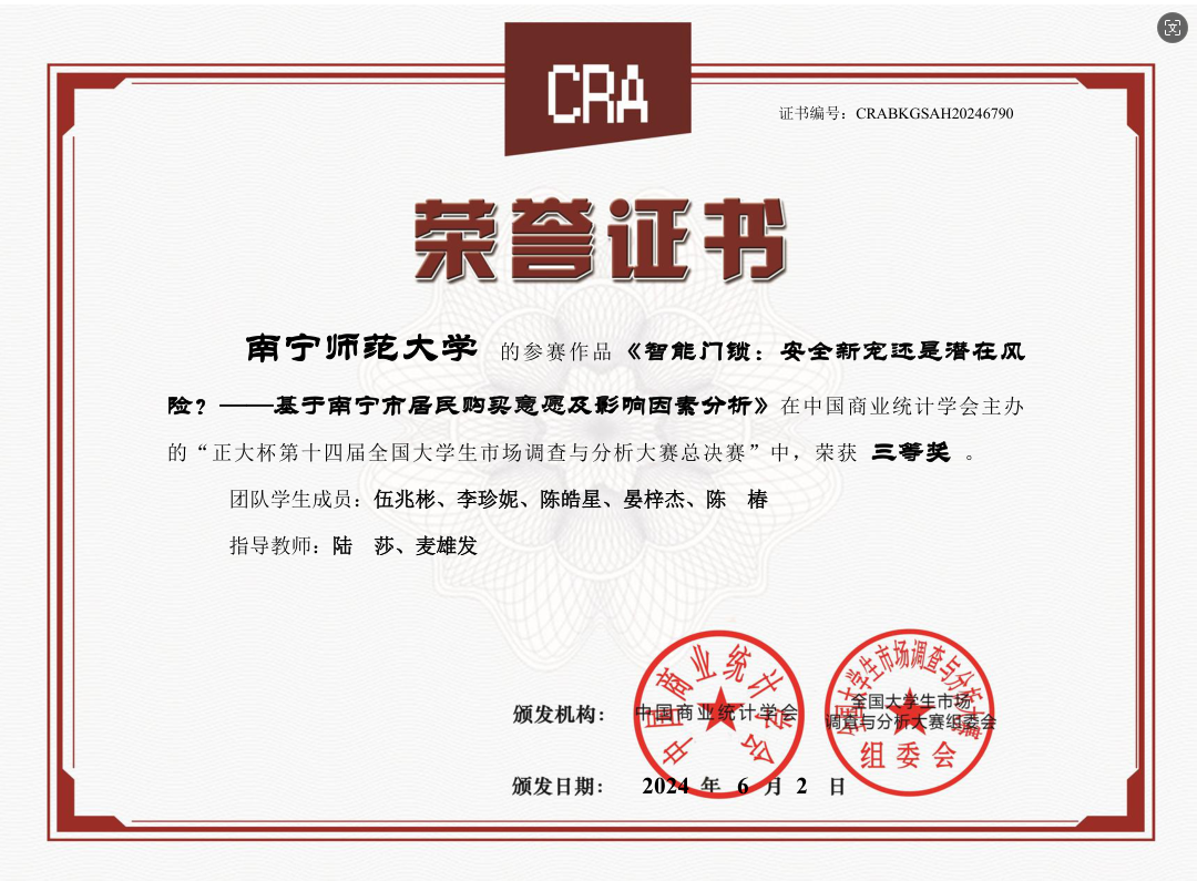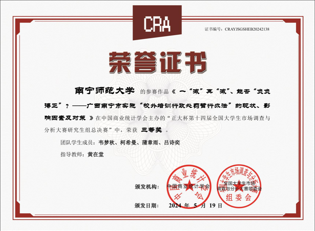 由中国商业统计学会、全国老员工市场调查与分析大赛组委会主办的第十四届全国老员工市场调查与分析大赛已圆满落下帷幕。本次大赛于 2023年9月启动,吸引了全国1063所高校,29.5万名老员工报名参赛,经过理论知识赛、校赛、省赛的层层选拔决出各奖项。在本次大赛中,公司学子积极参与,围绕社会和经济问题开展调查研究,通过精准定位以小见大,运用所学知识进行深入探讨和分析,给出有意义的结论和建议。公司参赛队共获得本科组国家三等奖1项、广西一等奖1项、二等奖9项和三等奖2项;研究生组获得国家三等奖1项、广西一等奖3项、三等奖3项。