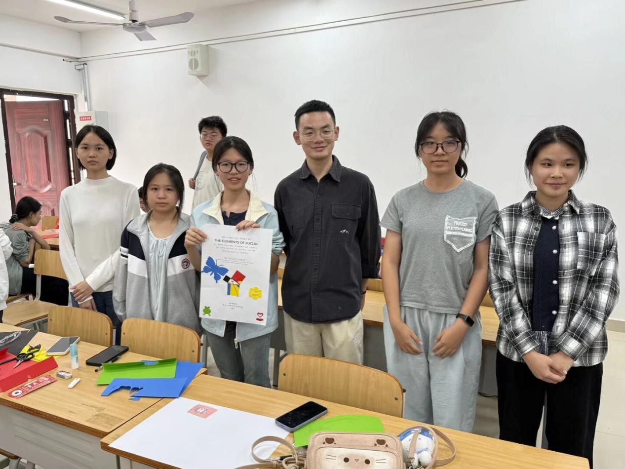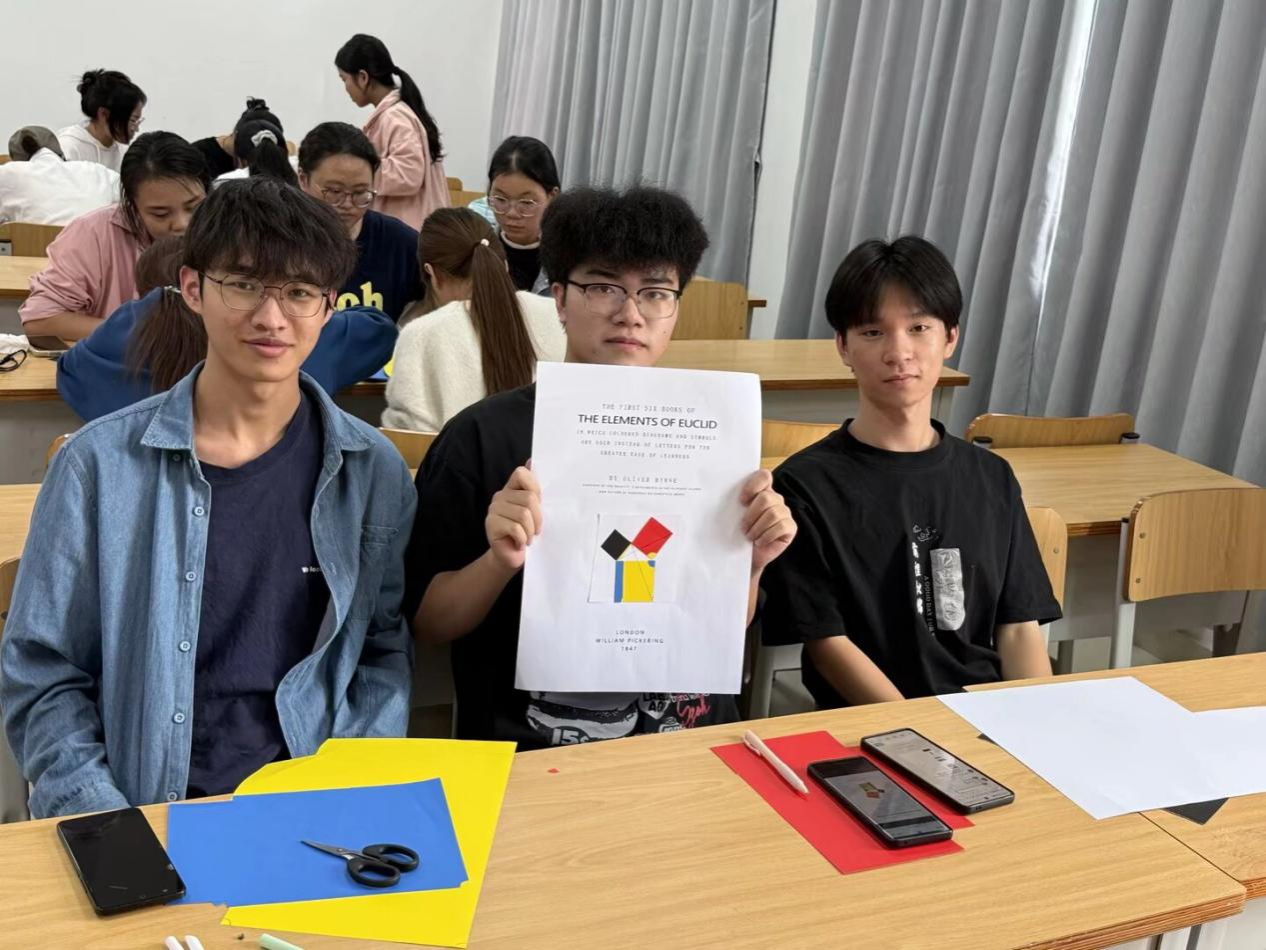 随着活动正式启动,同学们迅速投入创作。现场氛围热烈而有序,大家手持剪刀、彩纸,依据公司准备的设计稿分工协作。本次活动的设计稿由卢若楷老师设计提供,以“欧几里得的《几何原本》”、“斐波那契数列与黄金分割点” 等为核心主题,将抽象的数学概念转化为具象的剪纸图案。创作过程中,同学们不仅精准还原设计稿中的对称结构与比例关系,更不乏巧思创新——有的小组通过调整线条弧度优化黄金分割比例呈现,有的则在数列规律基础上增添创意元素,让每一件作品都兼具数理严谨性与艺术独特性。