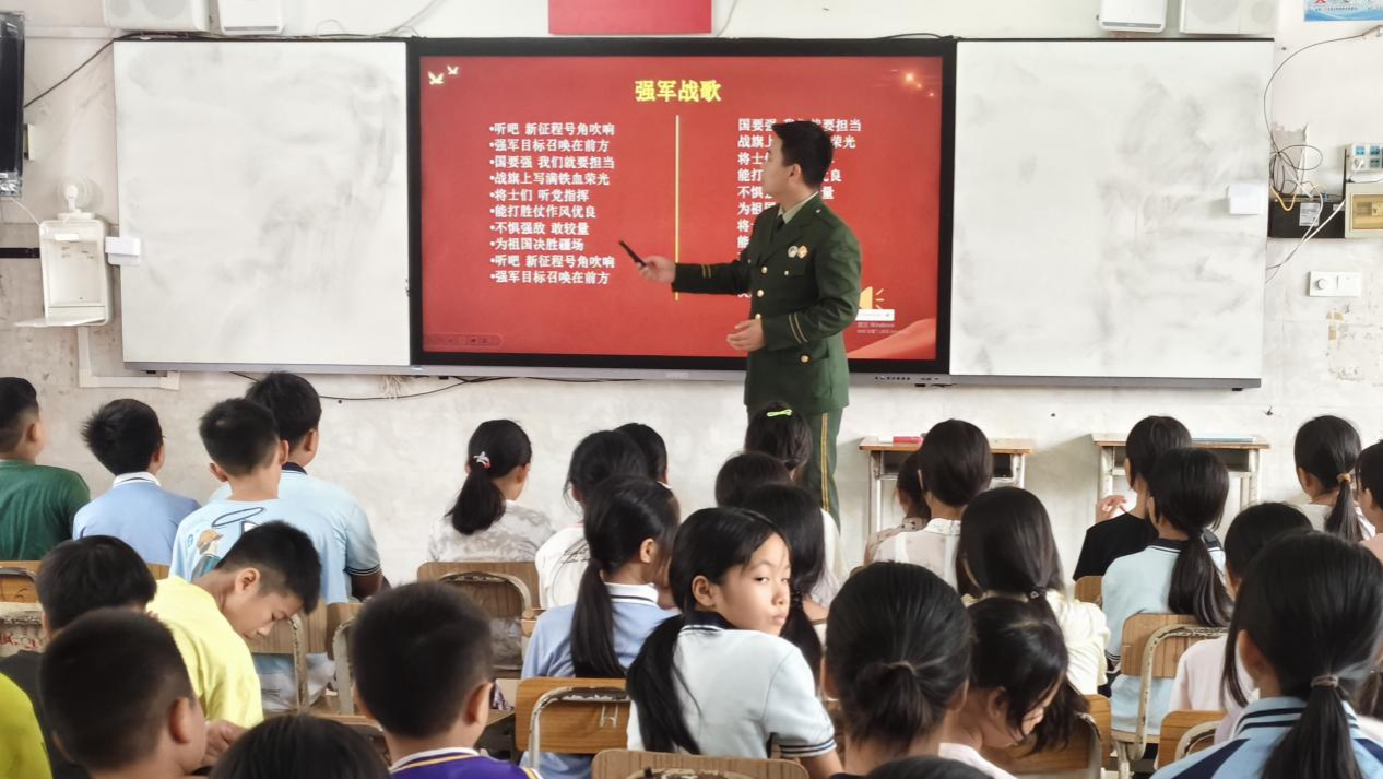 在军事理论宣讲中,实践队员方焦阳以互动游戏开篇,引导小员工们在地图上定位家乡,以生动形式播撒国防种子,迅速点燃课堂热情。随后,他用童趣化语言讲解界碑意义、可疑人员应对等边防知识,小员工们专注聆听、频频互动。情景演示环节里,上台的小员工挺直腰板模仿战士站岗,认真模样赢得阵阵掌声;《强军战歌》的激昂旋律中,嘹亮歌声回荡校园,让小员工们深切感受军人的荣耀。课程尾声的国旗队员选拔中,小员工们在“抬头、挺胸、步伐整齐”的口令下反复练习队列动作,专注神情尽显对国旗的敬畏。